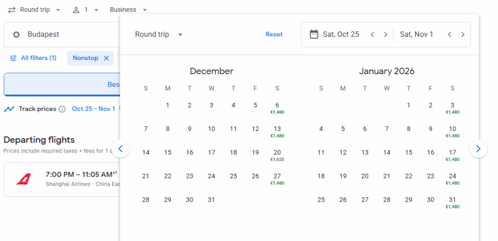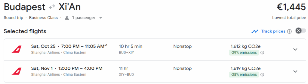 We found this great business class suite from Budapest, Hungary to Xi’An, China for €1,445, round trip on Shanghai Airlines. This fare is available from October 2025 to May 2026. Sample flight: