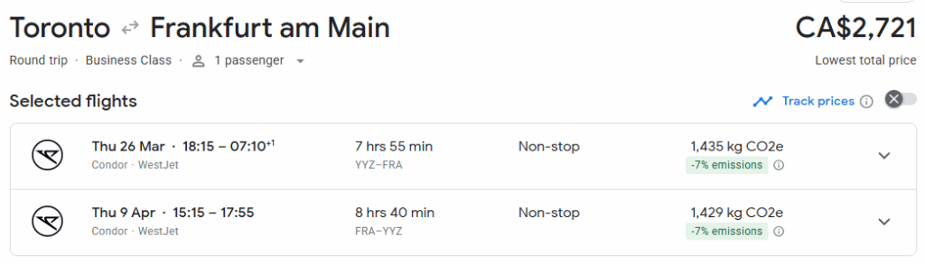 We found this wonderful business class nonstop from Toronto, Canada to Frankfurt, Germany for CA$2,721, round trip on Condor Airlines. This fare is available from November 2025 to August 2026. Sample flight: