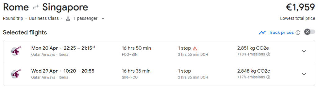 Don’t miss this opportunity to fly with the infamous QSuite from Rome, Italy to Singapore, Singapore for €1,959, round trip with Qatar Airways. Though, one of the leg might not be QSuite. Please look at the aircraft type “individual suite” to confirm. The availabilities for this fare are scattered from December 2025 to October 2026. Sample flight: