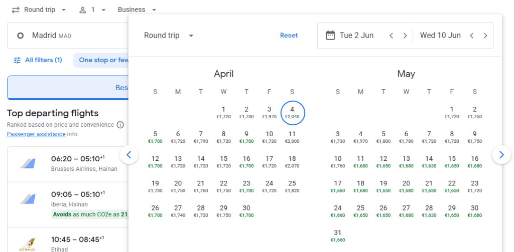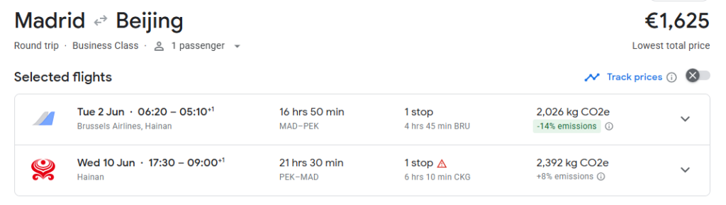 We found this great 5* business class from Madrid, Spain to Beijing, China for €1,625, round trip on Hainan Airlines. This fare is available from January to June 2026. Sample flight: