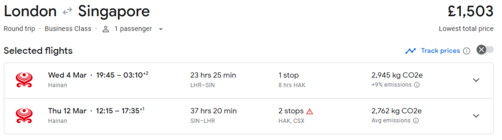 We found this great 5* business class from London, UK to Singapore, Singapore for £1,503, round trip on Hainan Airlines. This fare is available from February to March 2026. Sample flight:
